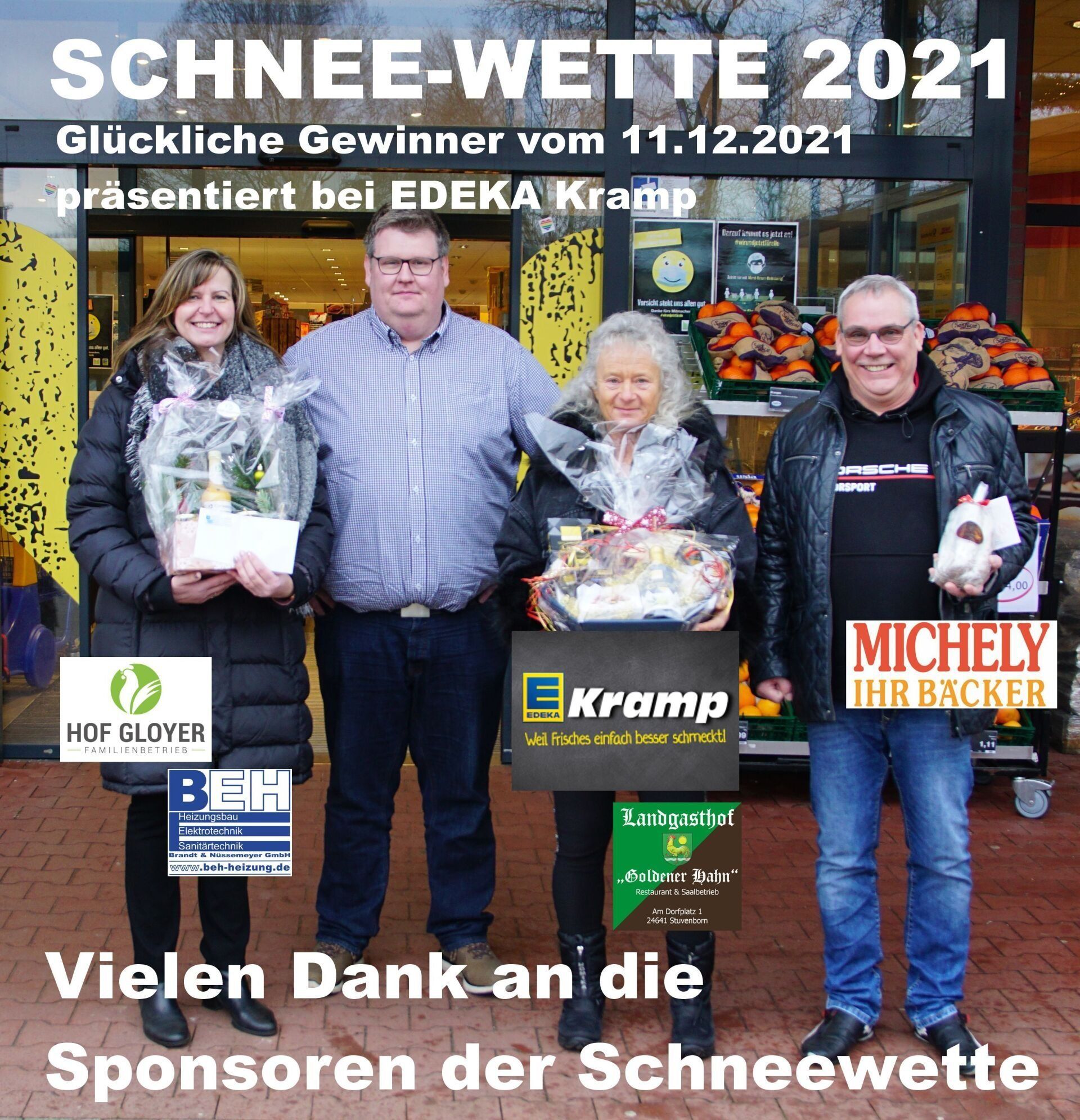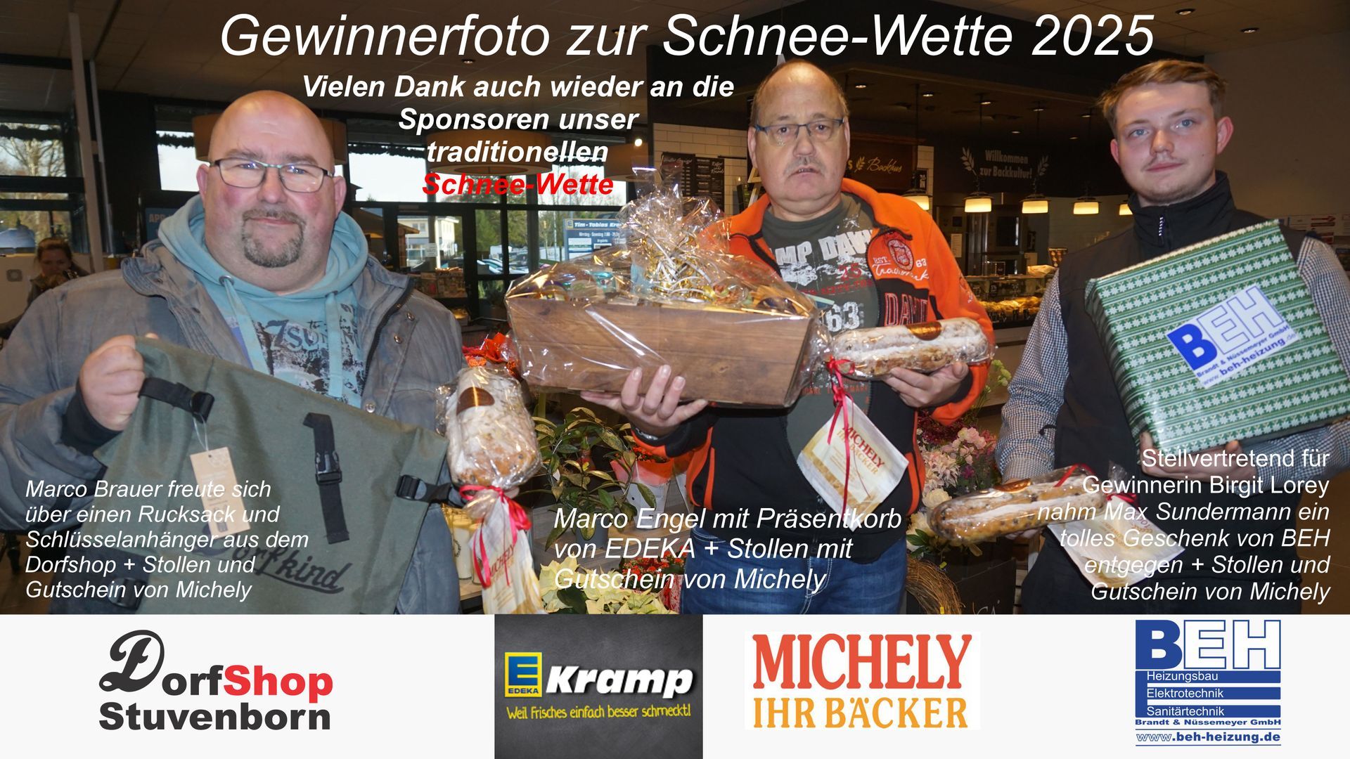 An dieser Stelle herzlichen Glückwunsch an unsere Gewinner der Schnee-Wette 2024 , die nun die Preise entgegen nehmen konnten. Den genauen Tag hat Ann Sophie Schneider mit dem 3. Jan. 25 getippt, knapp an der Vorhersage vorbei haben Meike Jochem (04.01.25) und Mathias Büchsler mit dem 02.01.25 getippt. Allerdings macht das gar nichts, denn auch wer nur um einen Tag daneben liegt, gehört dennoch zu den Gewinnern. Ein ganz herzliches Dankeschön an dieser Stelle auch an die Sponsoren EDEKA Kramp, BEH Heizung GmbH, Bäckerei Michely und der Dorf-Shop der Gemeinde, die diese Schnee-Wette aufwerten!