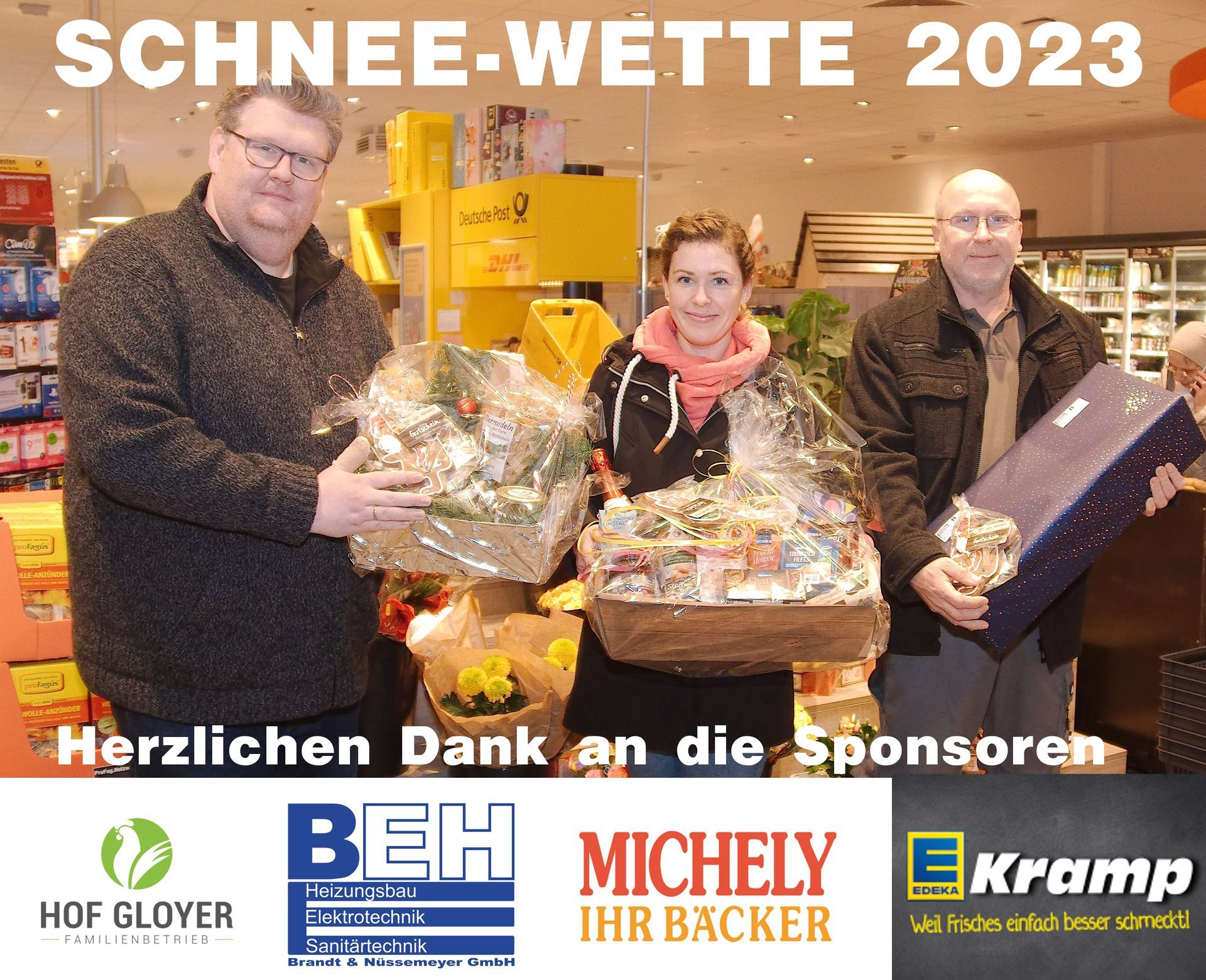 Die glücklichen Gewinner der SCHNEE-WETTE 2023 haben noch vor den Weihnachtsfeiertagen ihre Gewinne abgeholt. Mit Ina Berckemeyer (Bildmitte) als strahlende erste Siegerin die sich riesig über ihren Gewinn einen großen EDEKA Präsentkorb + Michely Einkaufsgutschein gefreut hat. Die weitere Preise bekamen heute André Rüter (re. im Bild) stellvertretend für seine Frau Annika Degner, ein Überraschungspaket von BEH + Michely Einkaufsgutschein und Lasse Steenbock einen tollen Präsentkorb vom Hof-Gloyer + Michely Einkaufsgutschein. Für Lasse Steenbock, er konnte heute bei der Übergabe persönlich nicht dabei sein, hielt Tim-Tobias Kramp (li. im Bild) den Gloyer Präsentkorb in die Kamera. Auch in diesem Jahr ging es bei der Schnee-Wette wieder sehr schnell und die Tipps gingen im Sekundentempo ein. Auch Wahnsinn, wie gut die Wette mittlerweile von Euch allen angenommen wird und die Teilnehmerzahl wirklich beeindrucken hoch ist. Für die nächste Wette 2024 könnt Ihr Euch ja heute schon mal Gedanken machen und dann sehr schnell sein, was die Platzierung betrifft!